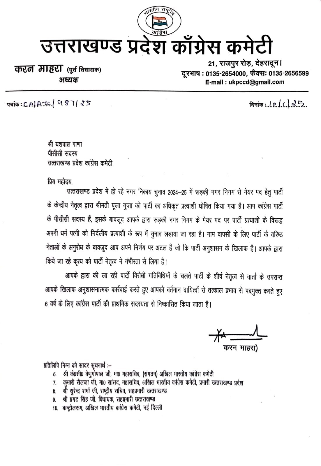उत्तराखंड कांग्रेस ने बागी नेताओं पर कड़ा एक्शन लिया, 6 साल के लिए पार्टी से निष्कासन